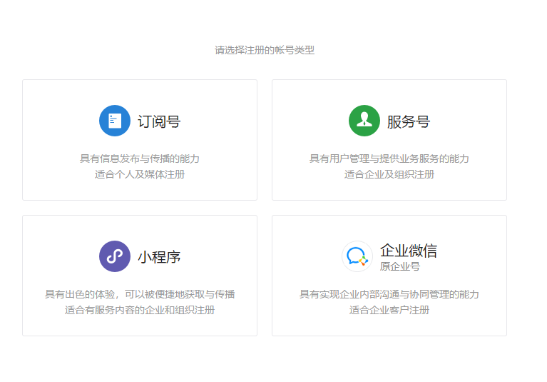 了解訂閱號、服務號和企業(yè)微信的區(qū)別后,選擇想要的帳號類型;