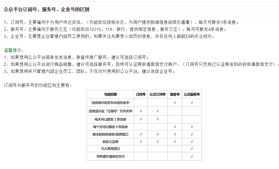 服務號:主要偏向于服務交互,每月可群發(fā)4條消息;(一次可群發(fā)8條圖文消息)對外推廣!