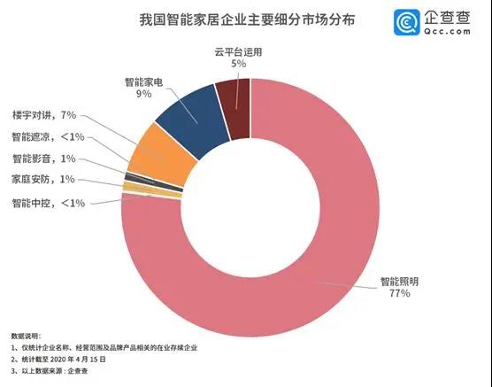 家電不再是冷冰冰的擺設(shè),而是被賦予了審美和情感需求的個性化智能產(chǎn)品。智能家居作為新興行業(yè),其無接觸式的交互方式,給疫情期間的人民帶來安全、智能的生活體驗,其優(yōu)勢開始凸顯。企查查整理了我國智能家居企業(yè)八大細(xì)分市場,數(shù)據(jù)表明智能照明、智能家電、樓宇對講相關(guān)企業(yè)占比較高,分別為77%,9%,7%;此外,家庭安防和智能影音也頗受市場青睞。