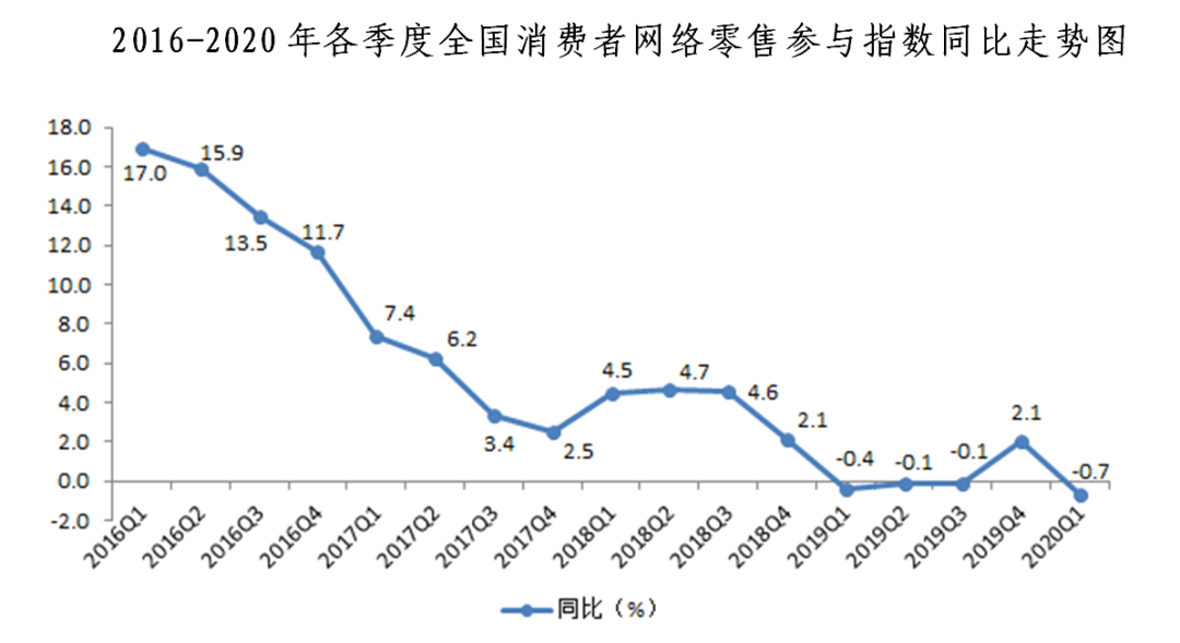 三、網(wǎng)絡零售參與指數(shù)同比下降0.7%,環(huán)比下降4.2%。