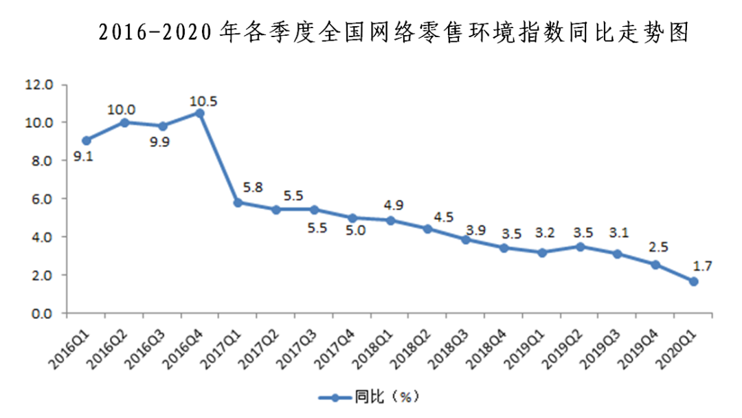 四、網(wǎng)絡零售環(huán)境指數(shù)同比增長1.7%,環(huán)比下降0.5%。