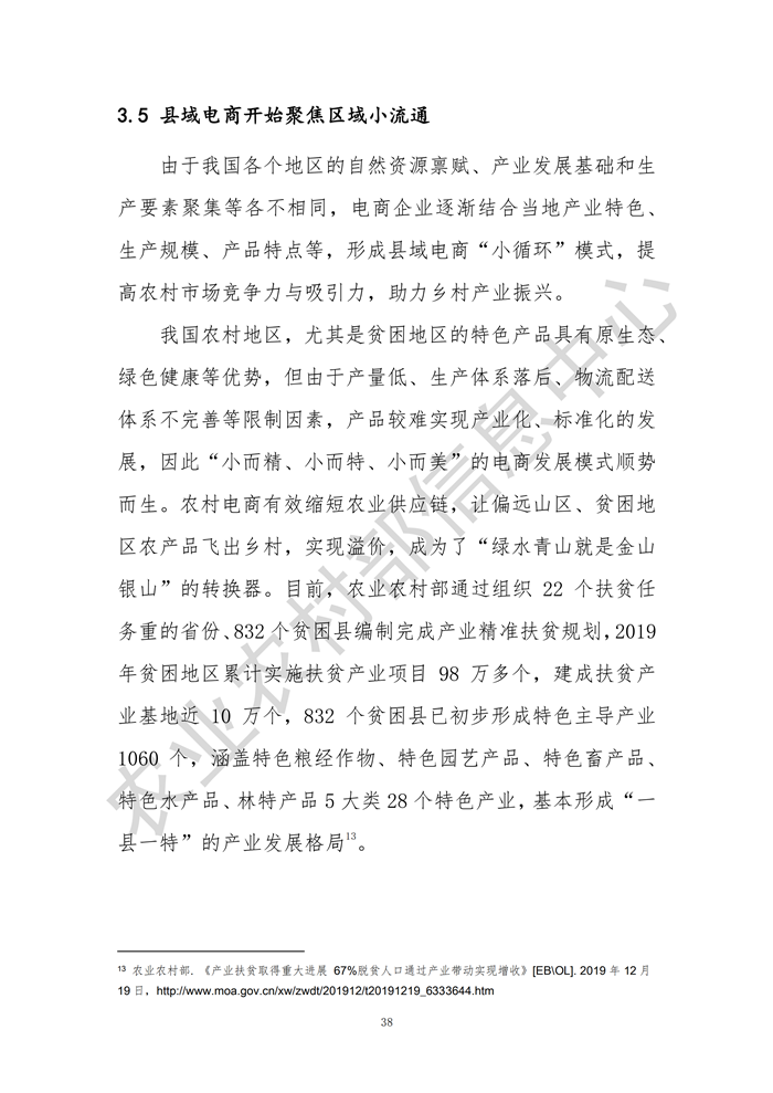 發(fā)布會指出,2019年全國2083個縣域網(wǎng)絡零售額達30961.6億元,同比增長23.5%,其中832個貧困縣網(wǎng)絡零售額達1076.1億元,同比增長31.2%;縣域農產(chǎn)品網(wǎng)絡零售額達2693.1億元,同比增長28.5%,其中832個貧困縣農產(chǎn)品網(wǎng)絡零售額為190.8億元,同比增長23.9%,需求側的數(shù)據(jù)、信息日益成為供給側結構性改革的新動能,農業(yè)的產(chǎn)業(yè)鏈、供應鏈、創(chuàng)新鏈、價值鏈正在加速重構,電子商務成為“綠水青山就是金山銀山”的重要“轉換器”。