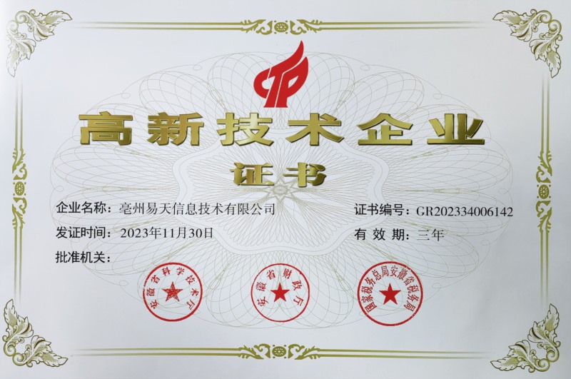 亳州易天信息技術(shù)有限公司于2023年11月30日成功獲得了安徽省科學(xué)技術(shù)廳、安徽省財(cái)政廳、國家稅務(wù)總局安徽省稅務(wù)局共同頒發(fā)的高新技術(shù)企業(yè)證書,證書編號:GR202334006142,這是對公司技術(shù)實(shí)力和創(chuàng)新能力的高度認(rèn)可。