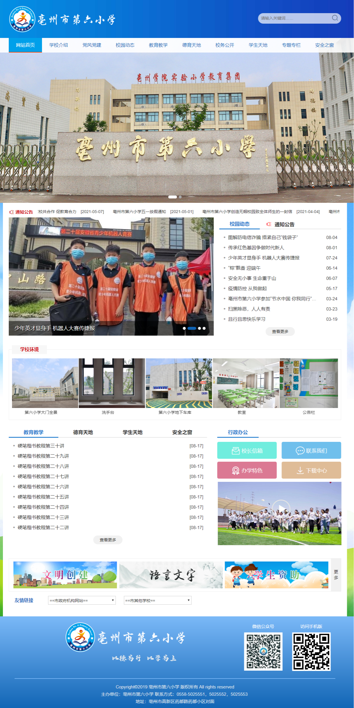 亳州市第六小學&mdash&mdash暨亳州學院實驗小學教育集團分校,是一所全日制、現代化、智慧化的公辦小學??傆玫孛娣e約50畝,總建筑面積約24000平方米,總投資1億元,辦學規(guī)模48個班,可容納2400名學生。??亳州市第六小學是一所建設高標準、設施高要求的智慧化校園。學校以&ldquo以德為行,以學為上&rdquo為校訓,把&ldquo育人&rdquo作為一切工作的出發(fā)點和落腳點,營造濃郁的學校文化氛圍,促進孩子全面發(fā)展、個性發(fā)展。學校致力于打造適合每個孩子的特色教育,把每個孩子放在心上,讓孩子靈性生...